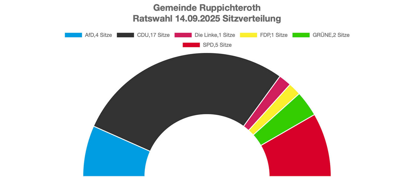 Ruppichteroth stellt die Weichen klar: Mit 60,45 Prozent gewann Matthias Jedich (CDU) die Bürgermeisterwahl bereits im ersten Durchgang. Im Rat verfügt die CDU mit 17 von 30 Sitzen über die absolute Mehrheit; dahinter folgen SPD (5), AfD (4), Grüne (2), Linke (1) und FDP (1). Die Christdemokraten können damit Haushalte, Investitionen und Satzungen ohne Koalitionspartner beschließen. Das bedeutet wahrscheinlich mehr Tempo, aber auch volle Verantwortung für das Ergebnis. Die Opposition bleibt auf Akzente über Initiativen und Kontrolle angewiesen.