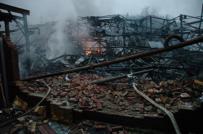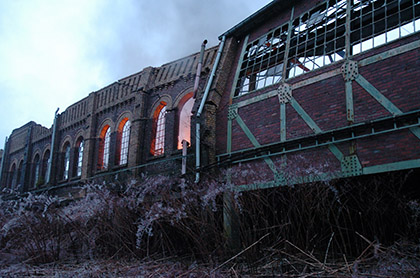 Eine alte Industriehalle in Windeck-Schladern ist in der Nacht von Sonntag auf Montag völlig ausgebrannt. Zwölf Stunden danach ist das Feuer gelöscht, trotzdem fachen immer wieder kleine Brände in dem rund 5000 Quadratmetern großen Gebäude auf. Weil das Dach eingestürzt ist, drohen die Wände ebenfalls nachzugeben. "Es ist zu gefährlich, weit nach innen vorzudringen", sagt der Windecker Feuerwehrsprecher Stefan Röhrig. Für die Wehrmänner sind die Löscharbeiten ein Kraftakt.