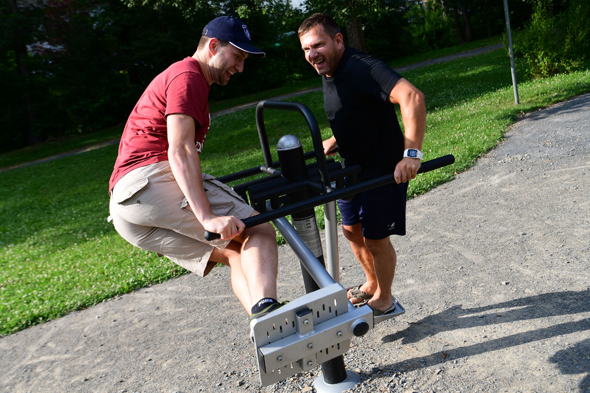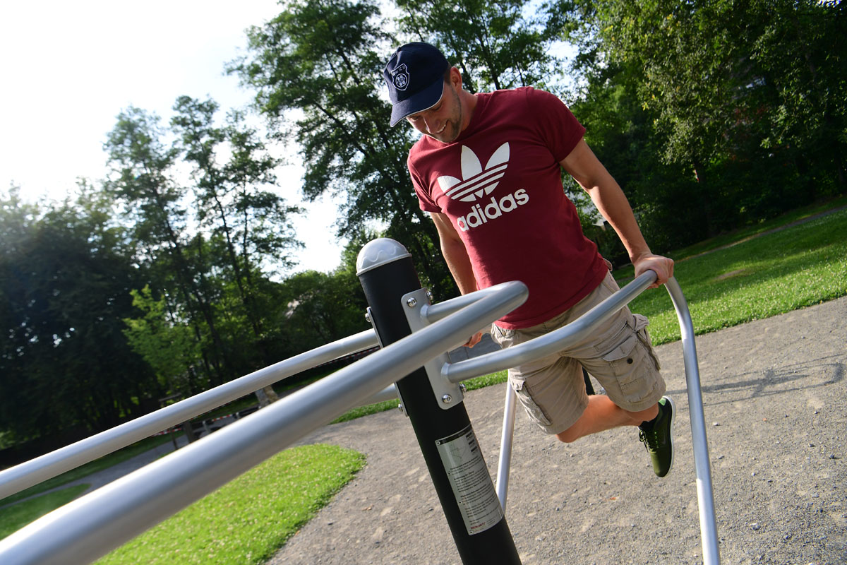 "Legen Sie die Unterarme auf die waagerechten Stangen und greifen Sie diese mit den Händen. Drücken Sie ihren Körper aus dieser Position nach oben und senken Sie ihn langsam wieder ab." So klingen sie, die Anleitungen der Fitnessgeräte im Schönenberger Mehrgenerationenpark. Seit einigen Wochen stehen sie auf der Wiese an der Grundschule und sind beliebt. Am Freitag, 1. September, werden sie mit einem Fest um 17 Uhr eingeweiht. Crowdfunding soll Spenden einbringen. Fotos: Die Fitnessgeräte im Mehrgenerationenpark [Nicolas Ottersbach]
