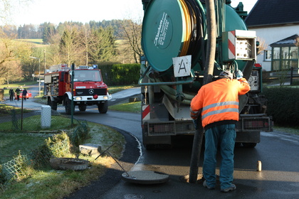 Zur technischen Unterstützung alarmierte man die Freiwillige Feuerwehr Ruppichteroth. Mit einem Dichtkissen sperrten die Wehrmänner vorsorglich den Abwasserkanal über den in Flussrichtung nächstgelegenen Gully ab. Restliches Hydrauliköl auf der Straße wurde mit Bindemittel aufgenommen. Das Ordnungsamt beauftrage eine Rohrreinigungsfirma zur Spülung des Rohres. Das verunreinigte Abwasser wurde durch die Firma abgesaugt und entsorgt. "Gefahr für die Umwelt bestand nicht", so Unterbrandmeister Ralf Helbing, "die Klärwerke können diese geringe Menge Öl rückstandslos rausfiltern". Insgesamt dauerte der Einsatz über zwei Stunden. Anwohner versorgten die Wehrmänner zwischenzeitlich mit heißem Kaffee.