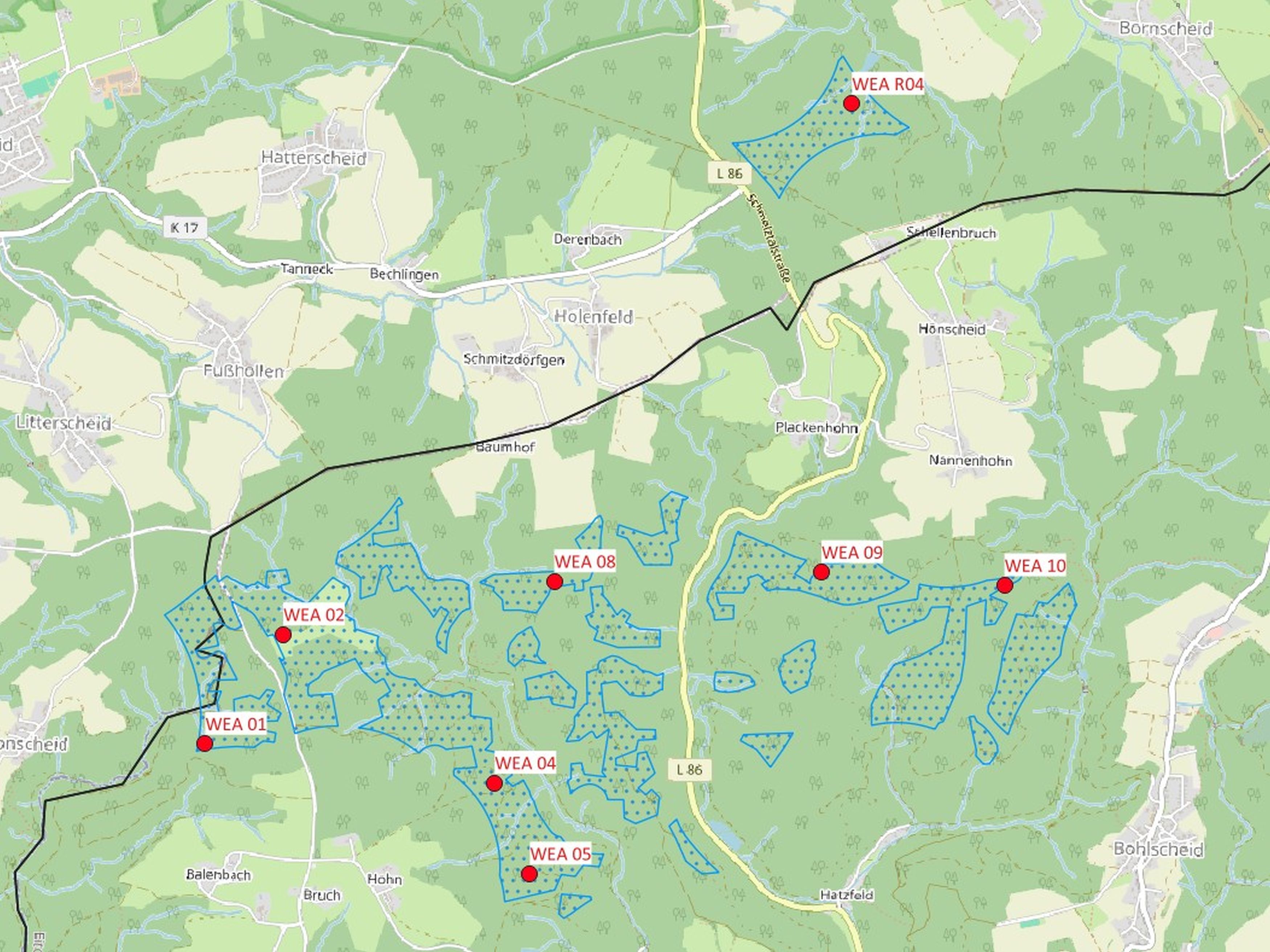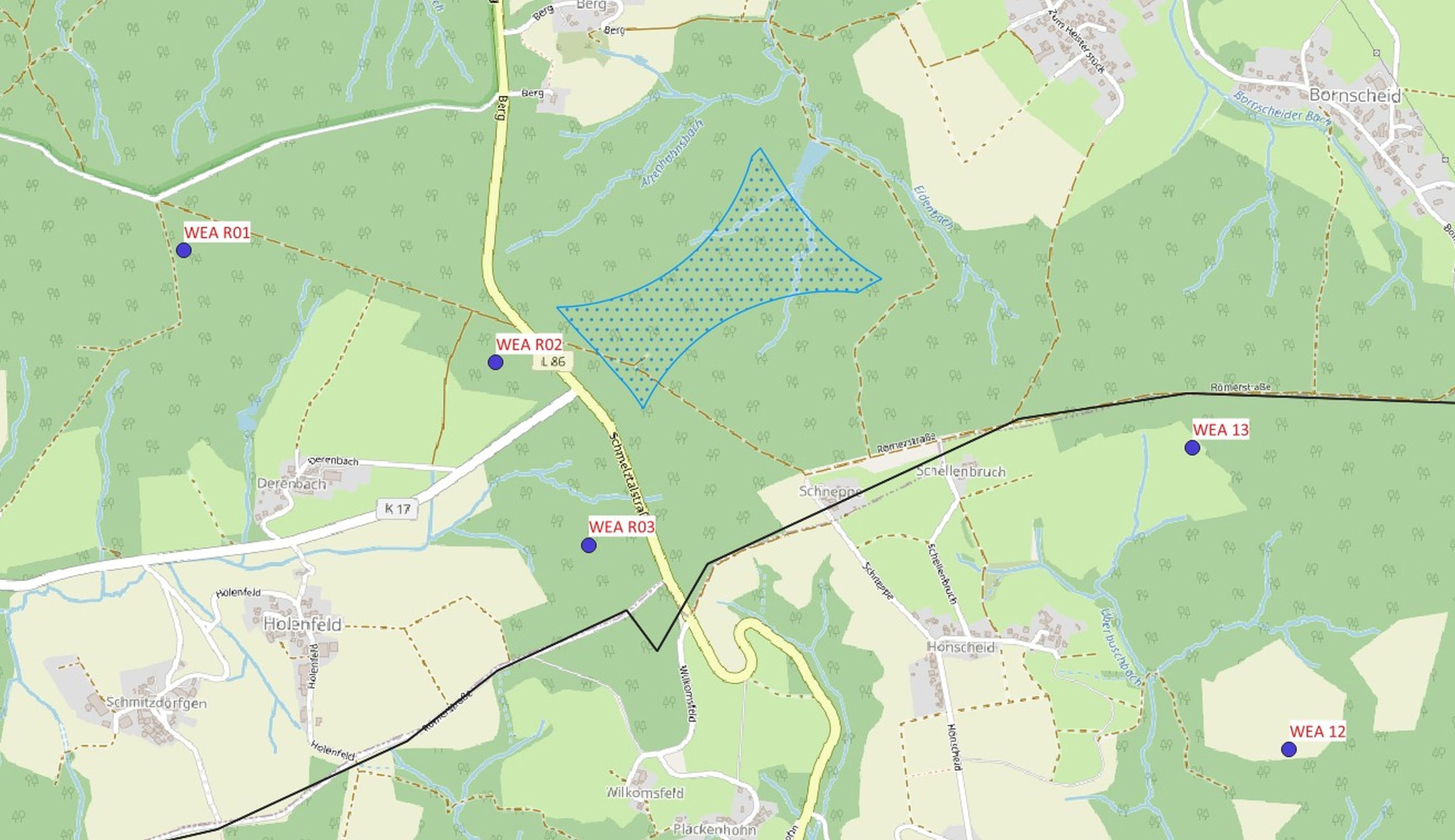 Betroffen vom Rückzug sind die Anlagen mit den Kennzeichnungen WEA 12, WEA 13 (Eitorf) und WEA R01, WEA R02 und WEA R03 (Ruppichteroth). Sie liegen nach Angaben des Kreises außerhalb der Windenergiegebiete, die der Regionalrat Köln im „Sachlichen Teilplan Erneuerbare Energien“ zum Regionalplan Köln festgelegt hat. Damit verbleibt auf Ruppichterother Gebiet nur noch das Windrad zwischen Bornscheid und Holenfeld.